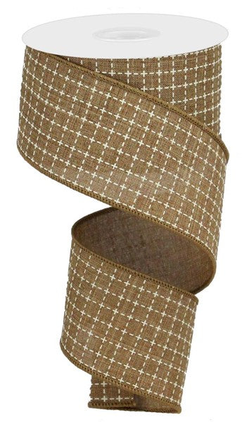 Wired Ribbon * Raised Stitched Squares * Tan and White Canvas * 2.5" x 10 Yards * RGA1045J1