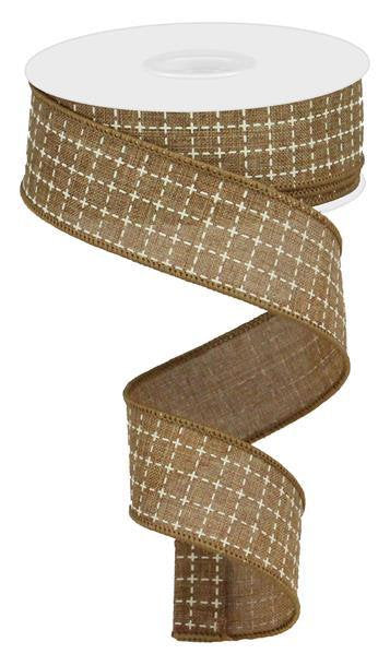 Wired Ribbon * Raised Stitched Squares * Tan and Cream * 1.5" x 10 Yards * RGA1044J1 * Canvas