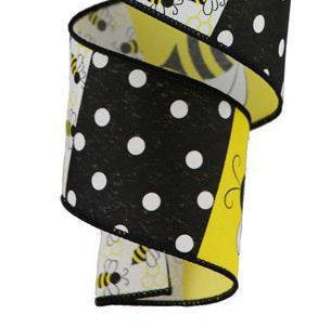 Wired Ribbon * Bumble Bees Block * White, Yellow and Black Canvas * 2.5" x 10 Yards * RGA194727