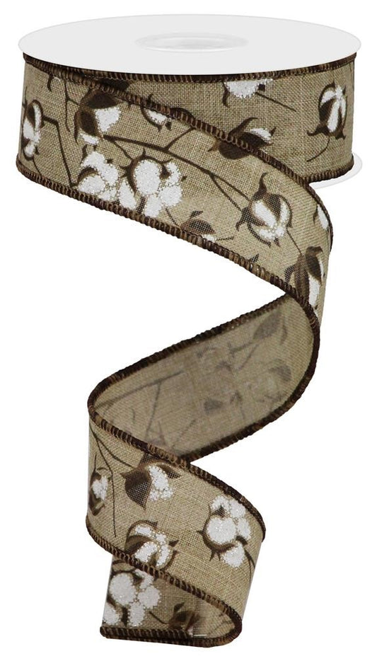 Wired Ribbon * Cotton Bolls * 1.5' x 10 Yards * Lt. Beige, Dk. Brown and White Canvas * RG0180801