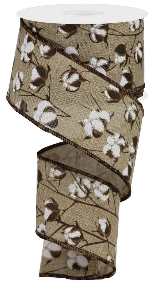 Wired Ribbon * Cotton Bolls * Lt. Beige, Dk. Brown and White * 2.5" x 10 Yards Canvas * RG0180901