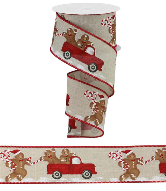 Wired Ribbon * Gingerbread Man with Red Truck * Natural, Brown, Red and Black * 2.5" x 10 Yards * RGA1838NF * Canvas