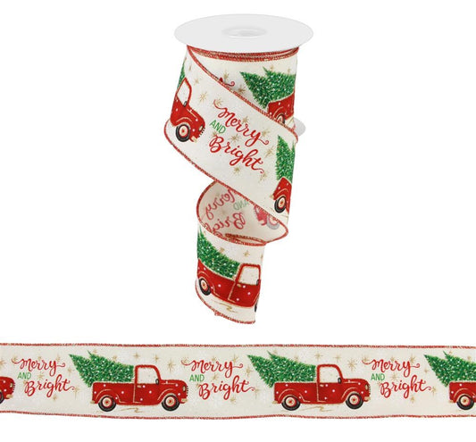 Holiday Wired Ribbon * Glitter Merry and Bright * Red Truck with Trees * Ivory, Red, Green, Black and Gold Glitter Canvas * 2.5" x 10 Yards * RGC152630