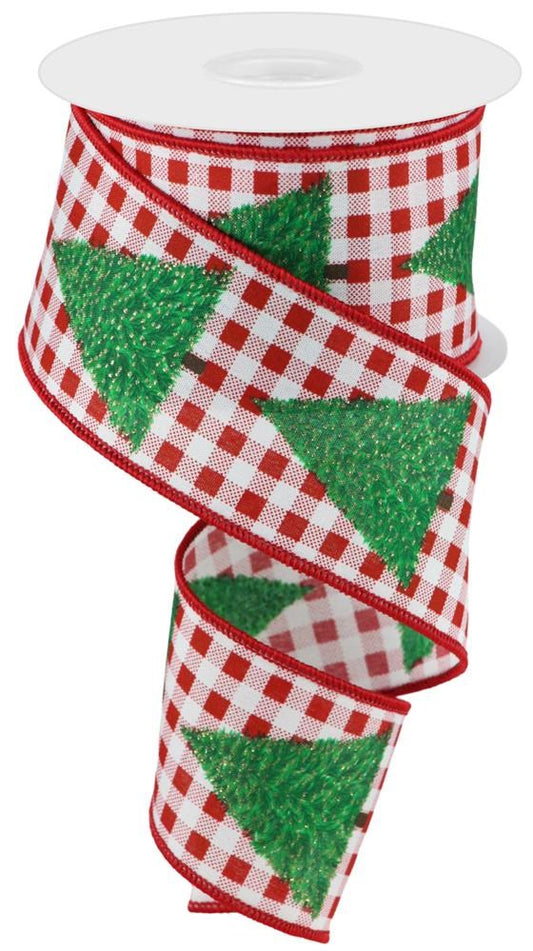 Wired Ribbon * Christmas Tree on Gingham * Glitter * White, Green Brown and Red * 2.5" x 10 Yards Canvas * RGC1699F4