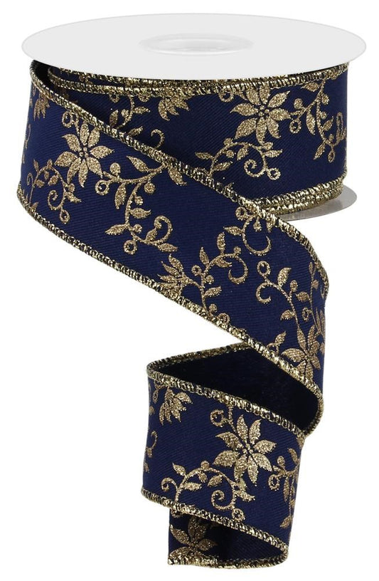 Wired Ribbon * Mini Poinsettia w/Swirls * Navy/Gold * 1.5" x 10 Yards * Canvas * RGE110119