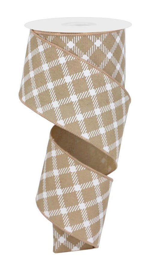 Wired Ribbon * Diamond Check * Beige/White * 2.5" x 10 Yards Canvas * RGE161101