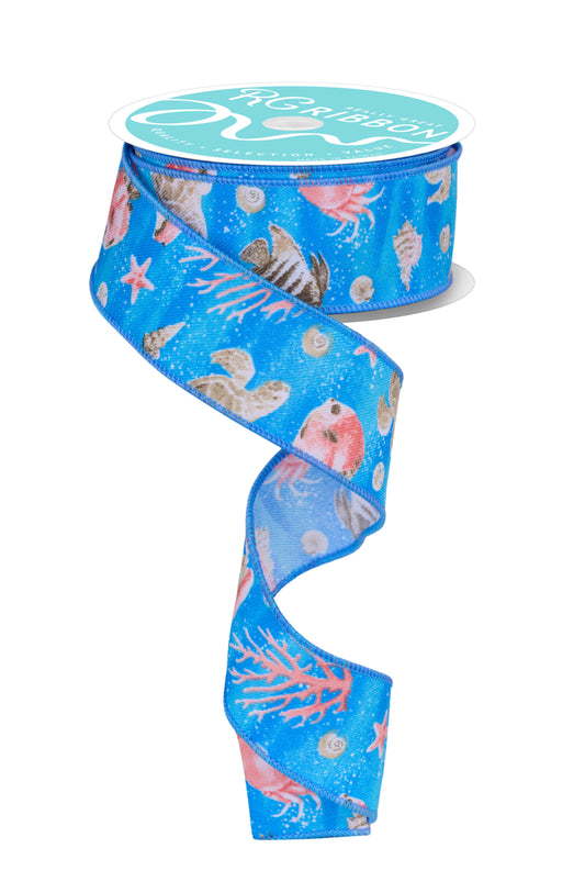 Wired Ribbon * Coastal Pattern * Blue, Coral, Cream, Brown and Lt Blue * 1.5" x 10 Yards * Canvas * RGF12513N