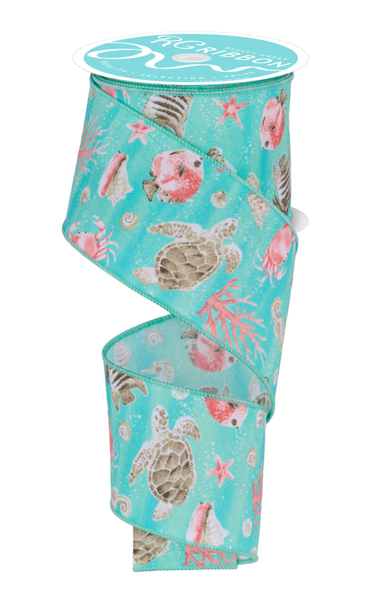 Wired Ribbon * Coastal Pattern * Dk. Mint, Coral, Cream, Brown and Turquoise * 2.5" x 10 Yards * Canvas * RGF12524M
