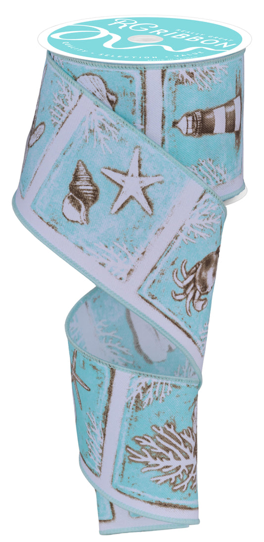Wired Ribbon * Coastal Blocks * Beige, Mint, Brow and White * 2.5" x 10 Yards * Canvas * RGF14102Y