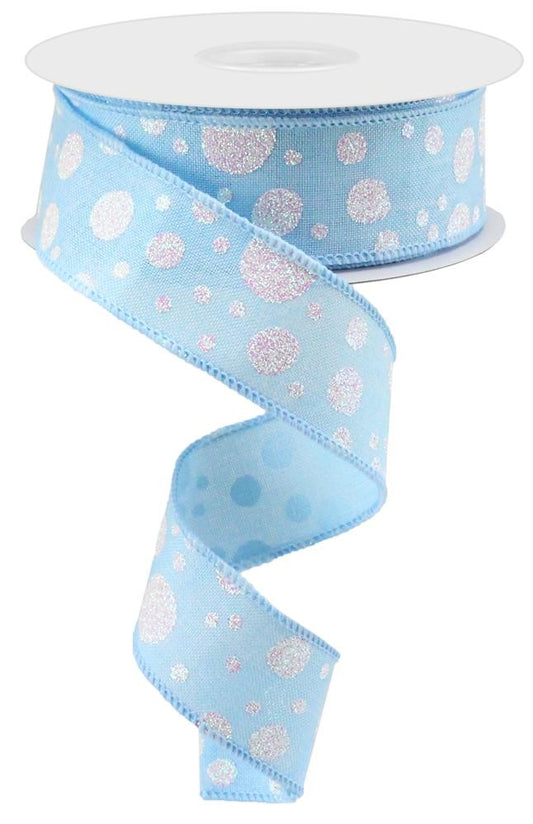 Wired Ribbon * Irregular Dots * Pale Blue, White and Iridescent Glitter Canvas * 1.5" x 10 Yards * RGA166814