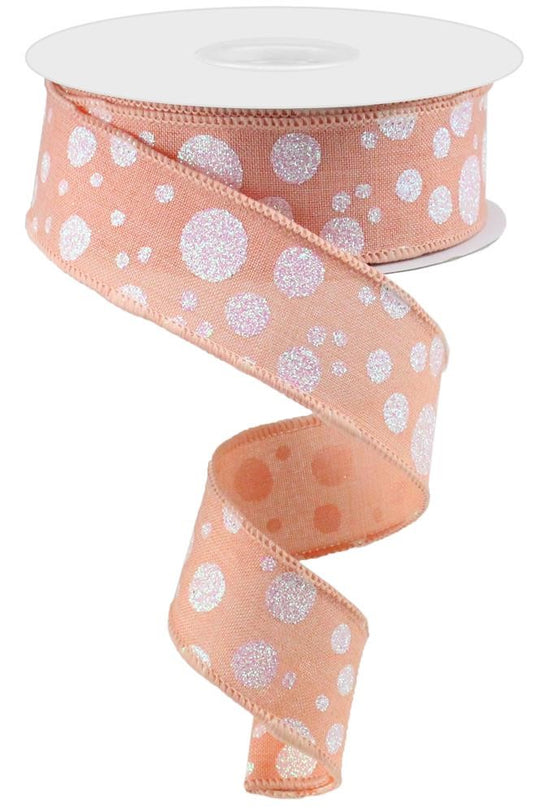 Wired Ribbon * Irregular Dots * Peach, White and Iridescent Glitter * Canvas * 1.5" x 10 Yards * RGA166821