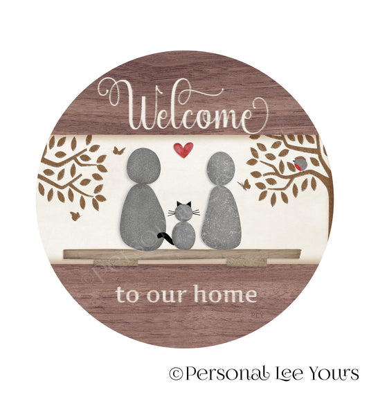 Welcome To Our Home Wreath Sign * Pebble Family of 2 with Cat * Round * Lightweight Metal