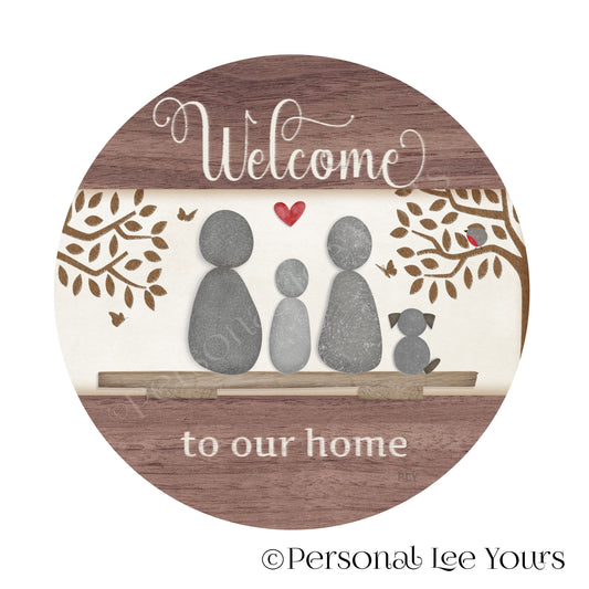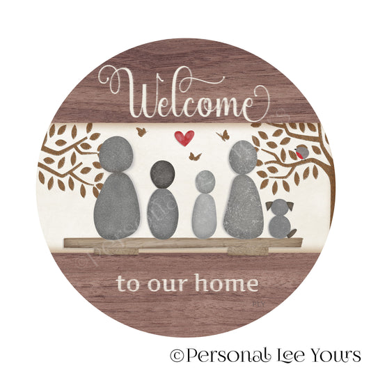 Welcome To Our Home Wreath Sign * Pebble Family of 4 with Dog * Round * Lightweight Metal