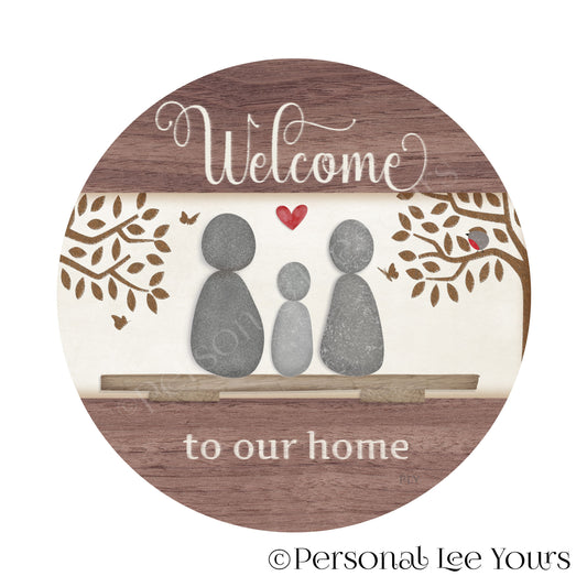 Welcome To Our Home Wreath Sign * Pebble Family of 3 * Round * Lightweight Metal