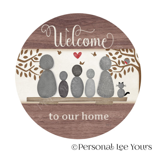 Welcome To Our Home Wreath Sign * Pebble Family of 6 with Cat * Round * Lightweight Metal