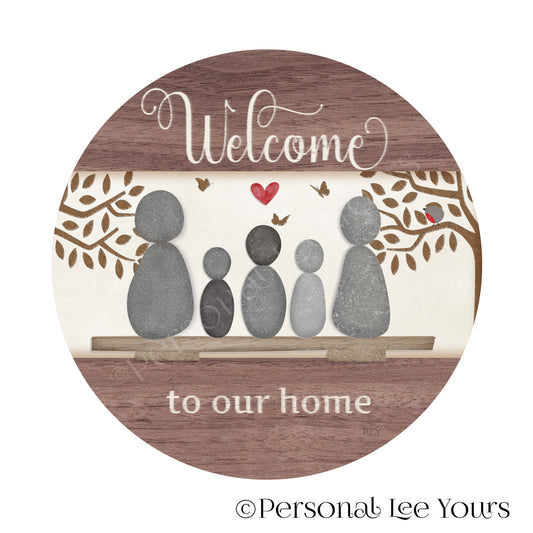 Welcome To Our Home Wreath Sign * Pebble Family of 5 * Round * Lightweight Metal