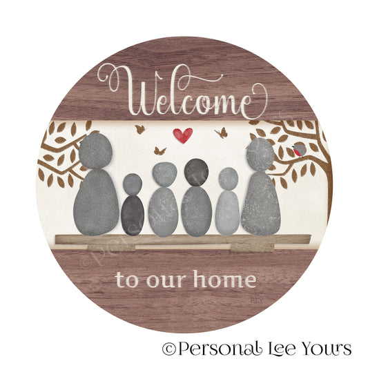 Welcome To Our Home Wreath Sign * Pebble Family of 6 * Round * Lightweight Metal