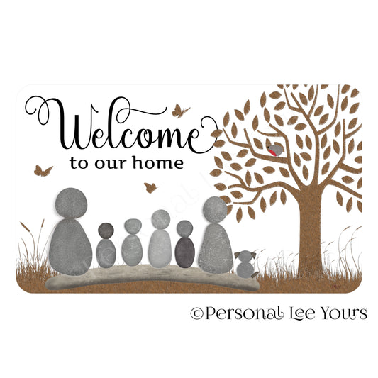 Welcome To Our Home Wreath Sign * Pebble Family of 6 with Cat * Horizontal * 3 Sizes * Lightweight Metal