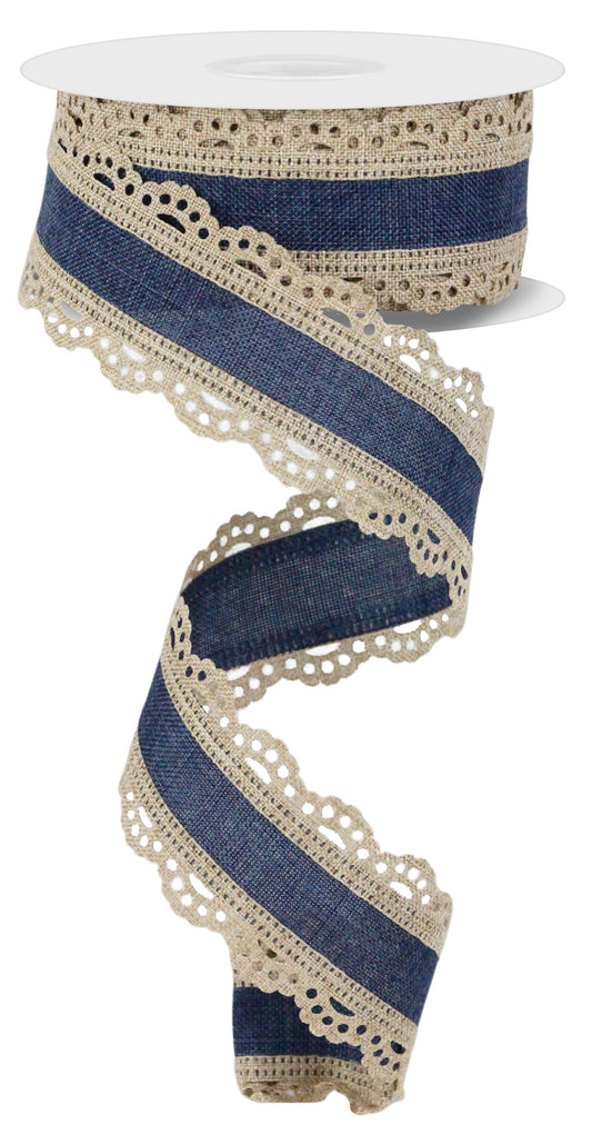 Wired Ribbon * Scalloped Edge * Light Beige/Navy Canvas * 1.5" x 10 Yards * RGA1541K6