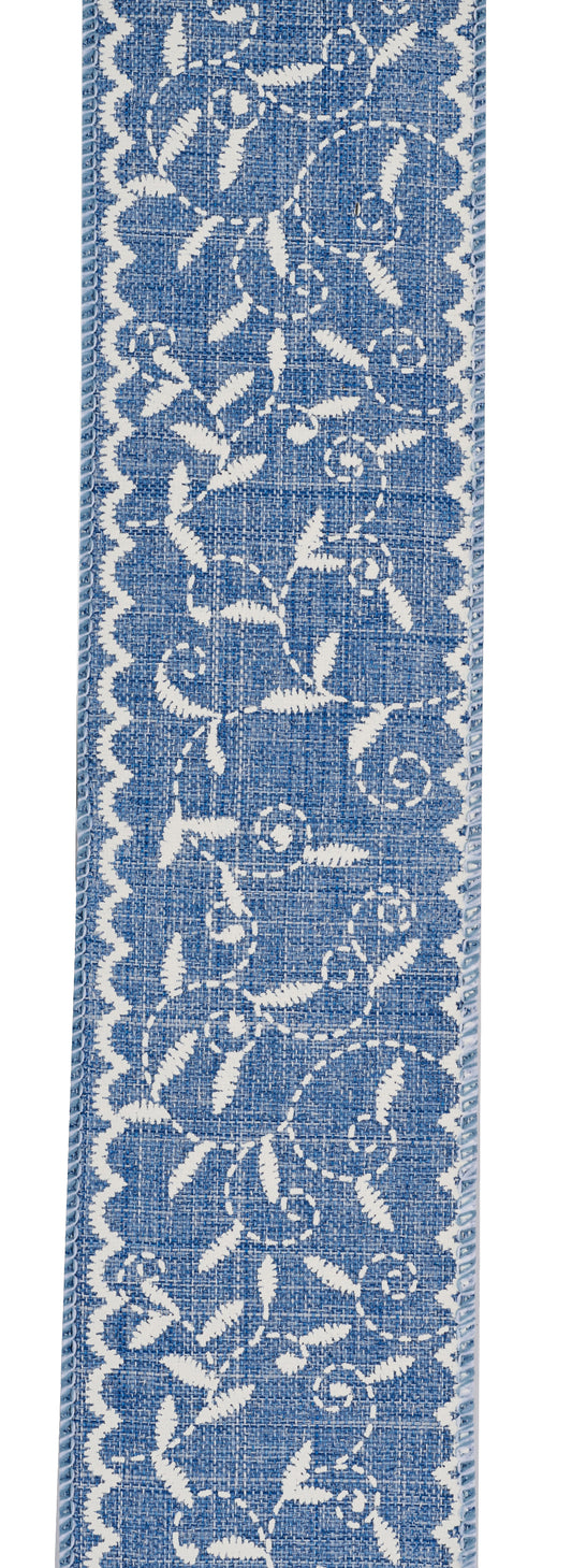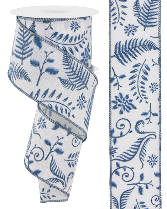 Wired Ribbon * Embroidered Greenery * White, Lt. Blue, Dk. Blue Canvas * 2.5" x 10 Yards * RGE1774WR