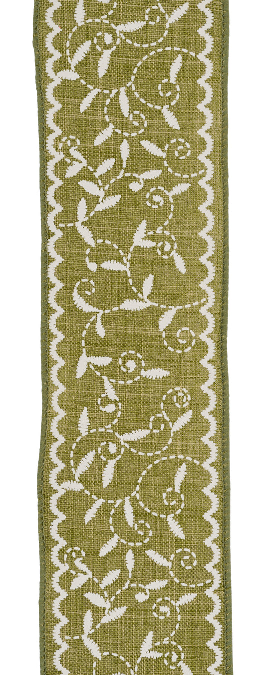 Wired Ribbon * Embroidered Greenery * Ivory and Green Canvas * 2.5" x 10 Yards * RG01309XT