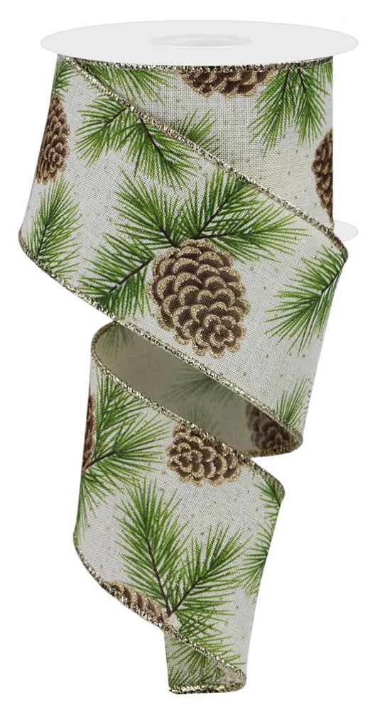 Wired Ribbon * Pinecone Branch * Ivory/Green/Brown/Gold Canvas * 2.5" x 10 Yards * RGF145930