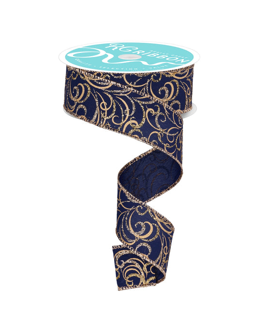 Wired Ribbon * Multi Swirls * Navy/Champagne/Gold Canvas * 1.5" x 10 Yards * RGF133619