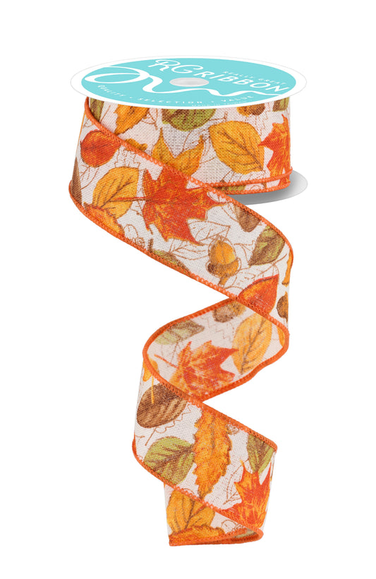 Wired Ribbon * Leaves and Acorns * Ivory/Multi Canvas * 1.5" x 10 Yards * RGF133837