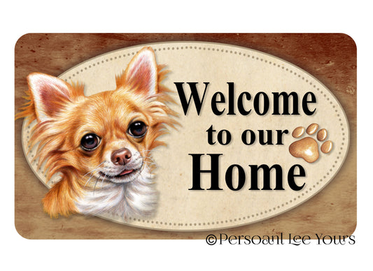 Dog Wreath Sign * Welcome * Long Haired Chihuahua * 3 Sizes * Lightweight Metal