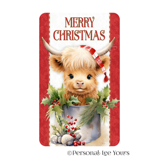 Holiday Wreath Sign * Merry Christmas Baby Highland Cow * Vertical * 4 Sizes * Lightweight Metal