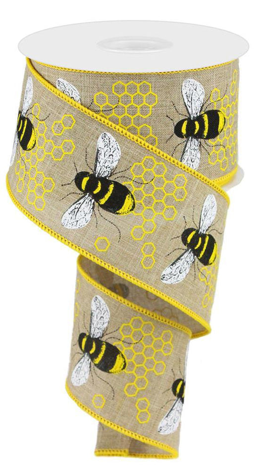 Wired Ribbon * Bumble Bees * Lt. Beige, White, Yellow and Black Canvas * 2.5" x 10 Yards * RGC179801