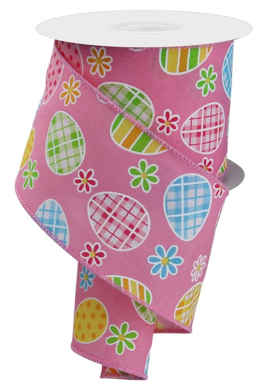 Wired Ribbon * Check Plaid Eggs With Daisies * Green, Blue, Lime, Pink, Gold and Yellow PG Canvas * 2.5" x 10 Yards * RGE1406A4