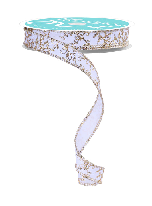 Wired Ribbon * Glitter Mini Leaves * White/Gold * Canvas * 5/8" x 10 Yards * RGF1393C6