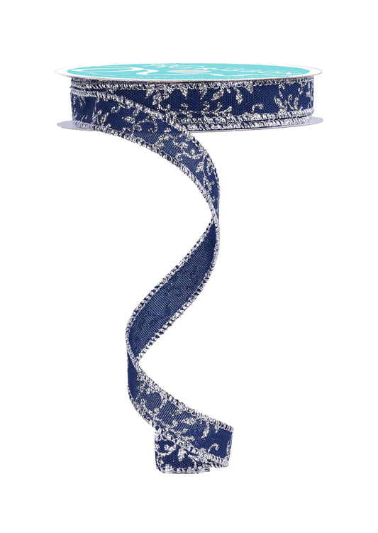 Wired Ribbon * Glitter Mini Leaves * Silver/Navy * Canvas * 5/8" x 10 Yards * RGF1394T1