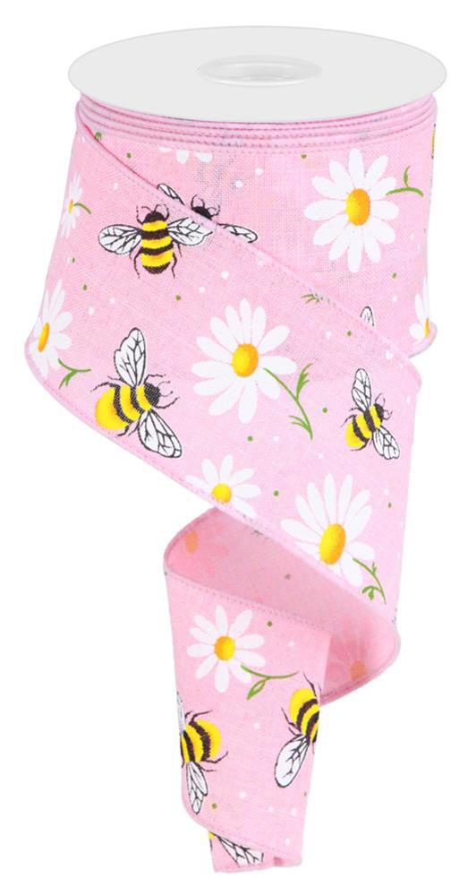 Wired Ribbon * Bumble Bees And Daisies * Lt. Pink, White, Yellow, Green, Orange and Black * 2.5" x 10 Yards * RGC184815