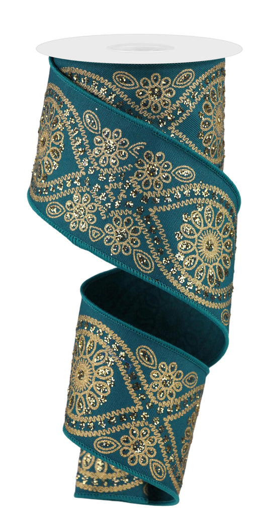 Wired Ribbon * Deluxe Wavy Floral * Dark Teal/Gold Canvas * 2.5" x 10 Yards * RGE196271