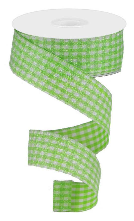 Wired Ribbon * Glitter Gingham Check * Lime Green and White Canvas * 1.5" x 10 Yards * RGA179633