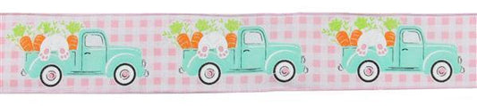 Easter Wired Ribbon * Truck With Bunny And Carrots on Pink Check * Canvas * 2.5" x 10 Yards * RGA1603WT