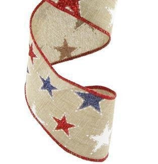 Patriotic Wired Ribbon * Dashed Glitter Stars * Beige, Red, White and Navy * 2.5" x 10 Yards * RG0165801 * Canvas