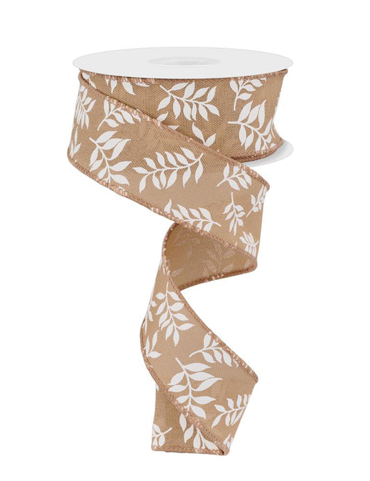 Wired Ribbon * Laurel Leaf * Beige and White * 1.5" x 10 Yards Canvas * RGF113201