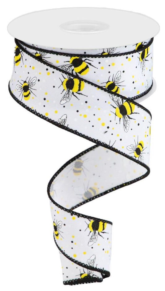 Wired Ribbon * Bumble Bees * White, Yellow and Black Canvas * 1.5" x 10 Yards * RGC1797J3