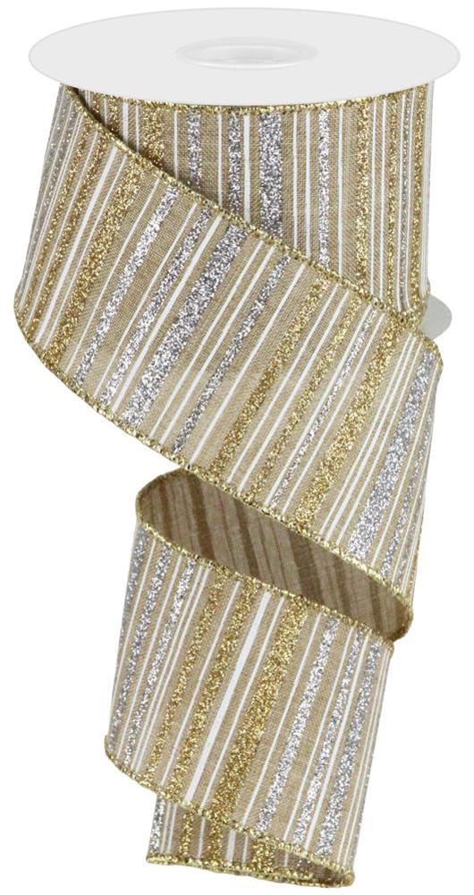 Wired Ribbon * Glitter Stripe * Lt Beige, Gold and Silver * 2.5" x 10 Yards Canvas * RGC195672