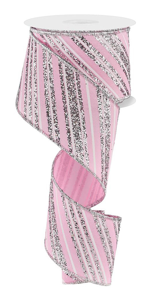 Wired Ribbon * Diagonal Lines * White, Pink and Silver 2.5" x 10 Yards Canvas * RGE185315