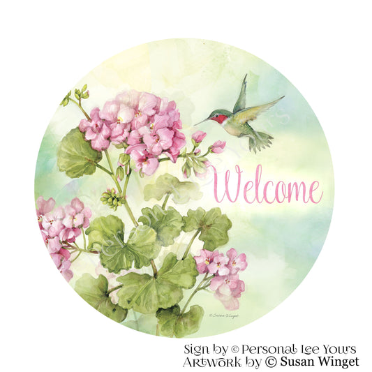 Susan Winget Exclusive Sign * Pink Geranium Welcome * Round * Lightweight Metal