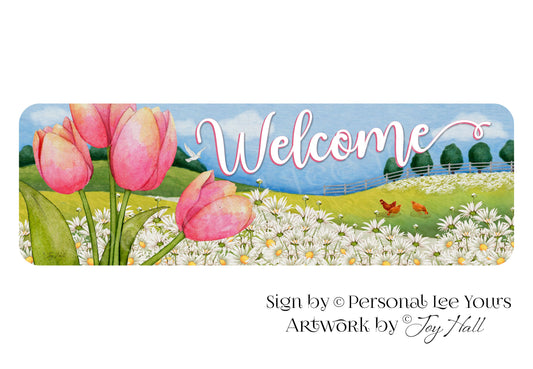 Joy Hall Exclusive Sign * Banner * Tulip and Daisy Welcome * 12" x 4" * Lightweight Metal