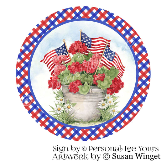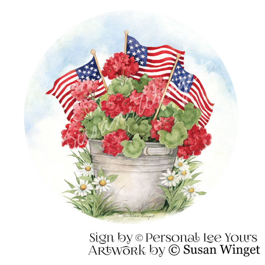Susan Winget Exclusive Sign * Patriotic Geraniums w/o Border * Round * Lightweight Metal