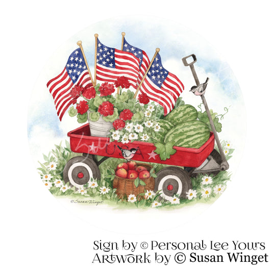 Susan Winget Exclusive Sign * Patriotic Little Red Wagon w/o Border * Round * Lightweight Metal