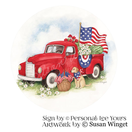 Susan Winget Exclusive Sign * Patriotic Red Truck With Border * Round * Lightweight Metal