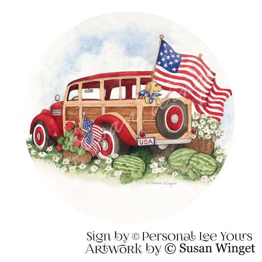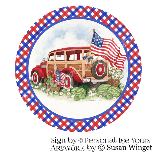 Susan Winget Exclusive Sign * Patriotic Little Red Wagon With Border * Round * Lightweight Metal