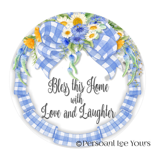 Metal Wreath Sign * Blue Bow * Bless This Home With Love and Laughter * Round * Lightweight